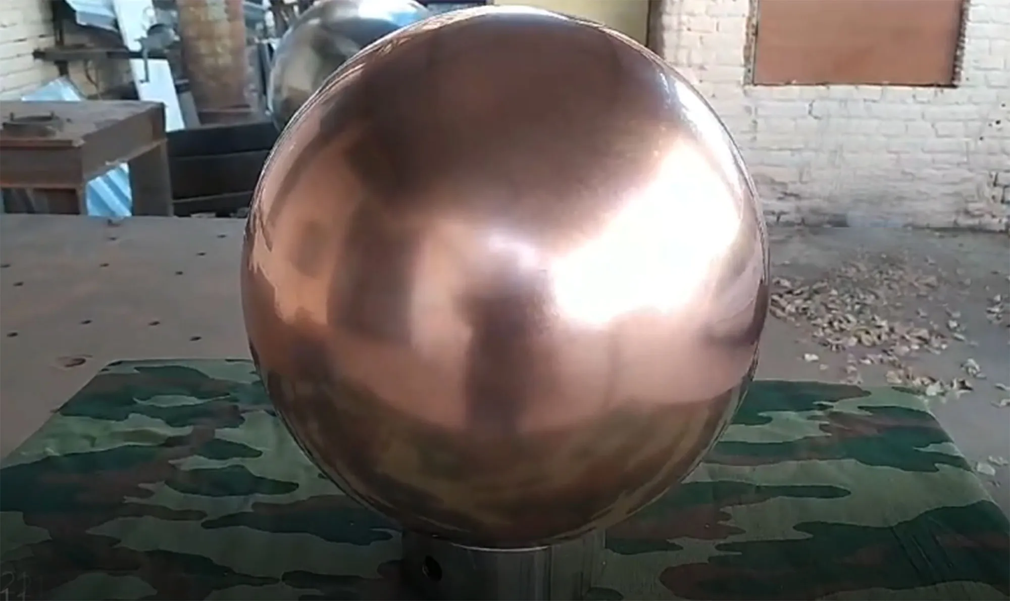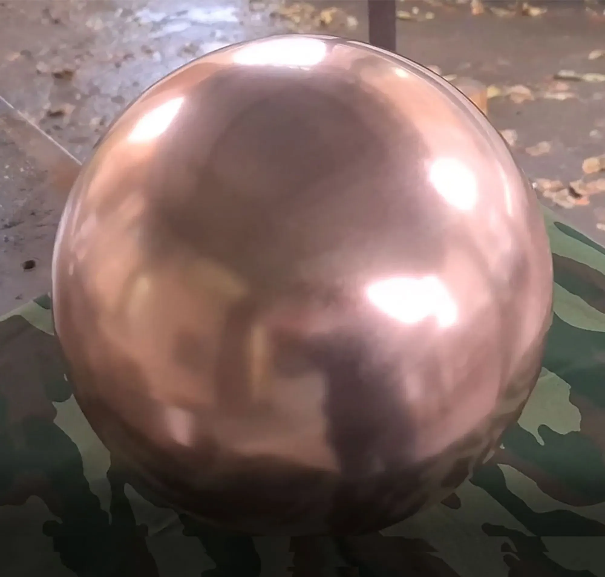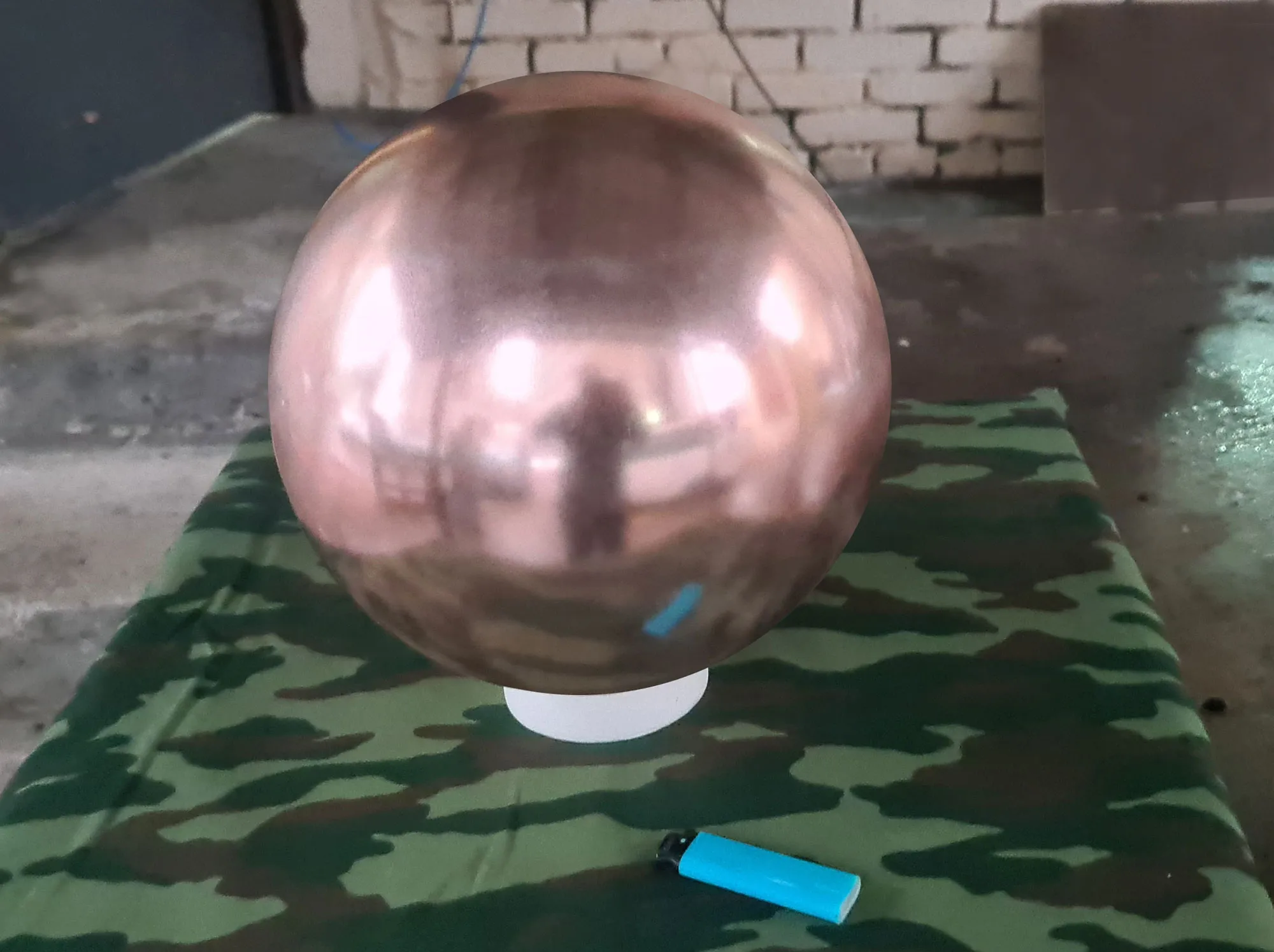 Медный шар представляет собой геометрически правильную сферу из листовой меди марки М1 изготовленный с поразительной точностью по диаметру, 250 миллиметров причём вручную. Каждая медная сфера тщательно нами полируется, чтобы достичь матового или зеркального блеска. Медный шар - это идеальное средство от стресса, которое лучше держать перед глазами, дома или в офисе прямо на письменном столе.