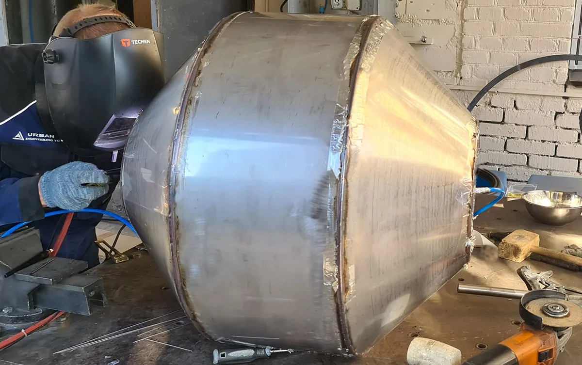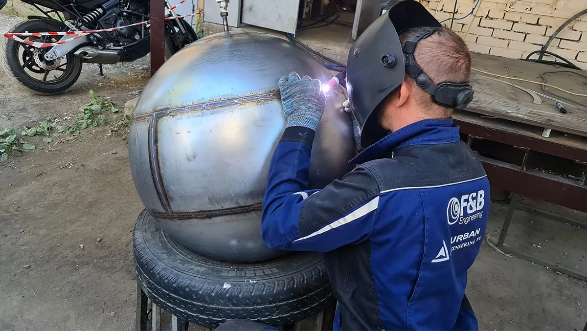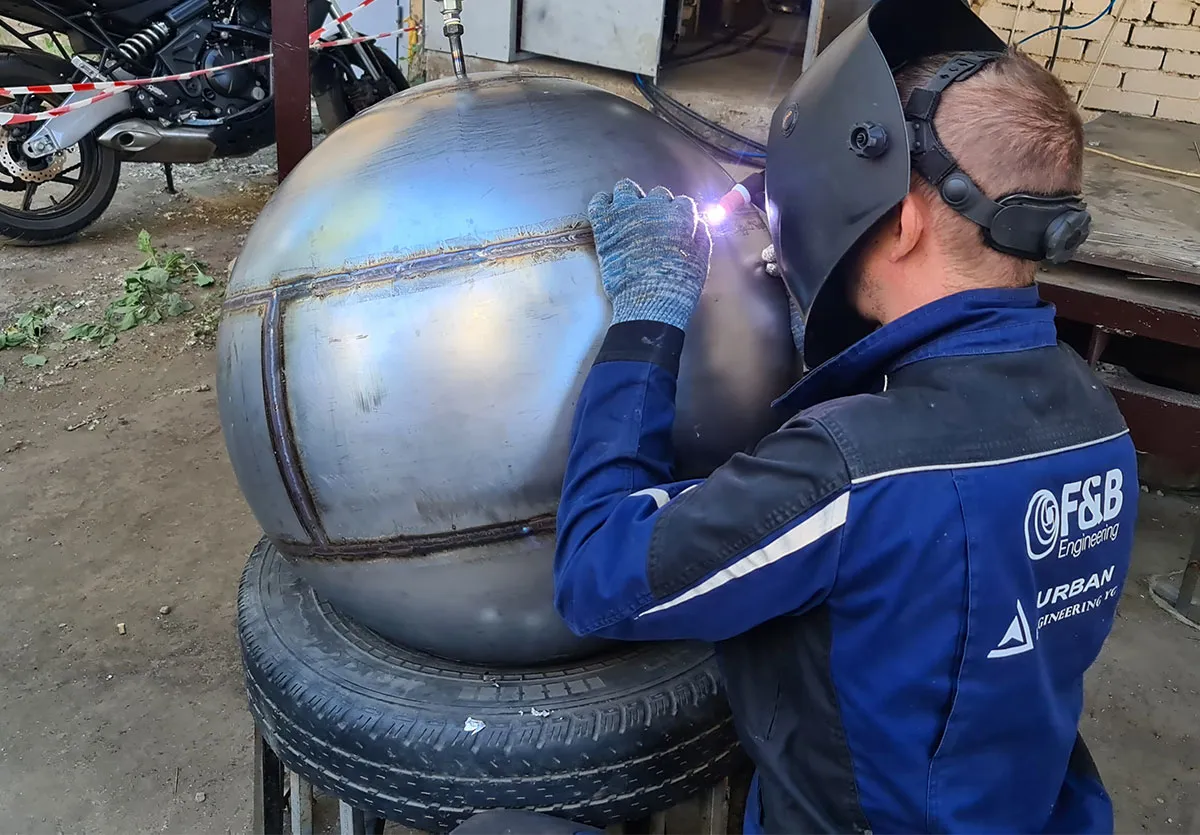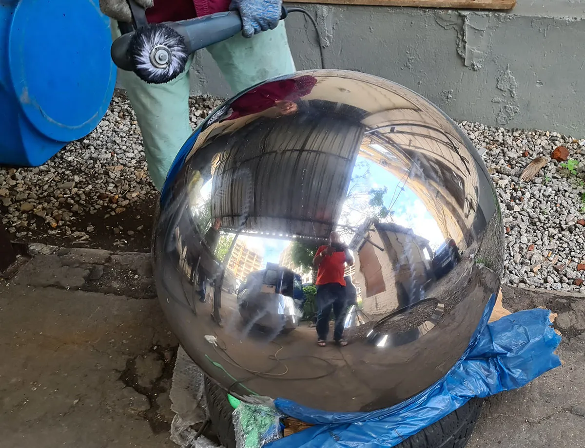 Создавая полую металлическую сферу - шар, наши технические специалисты сначала рассчитают контуры и размеры заготовок изделия. Заготовки вырезаются из большого листа нержавеющей стали и загибаются методом вальцовки в нужную форму. Затем с помощью аргонно-дуговой сварки заготовки собираются во едино. За сборкой изделия и сваркой швов следует проверка герметичности сварочных швов. Для формировки из только что собранного узла идеальной формы сферы в узел подаётся вода под давлением – происходит гидравлическая формовка шара. В завершение мы зачищаем и шлифуем сварочные швы, а сам шар полируем до зеркального блеска.