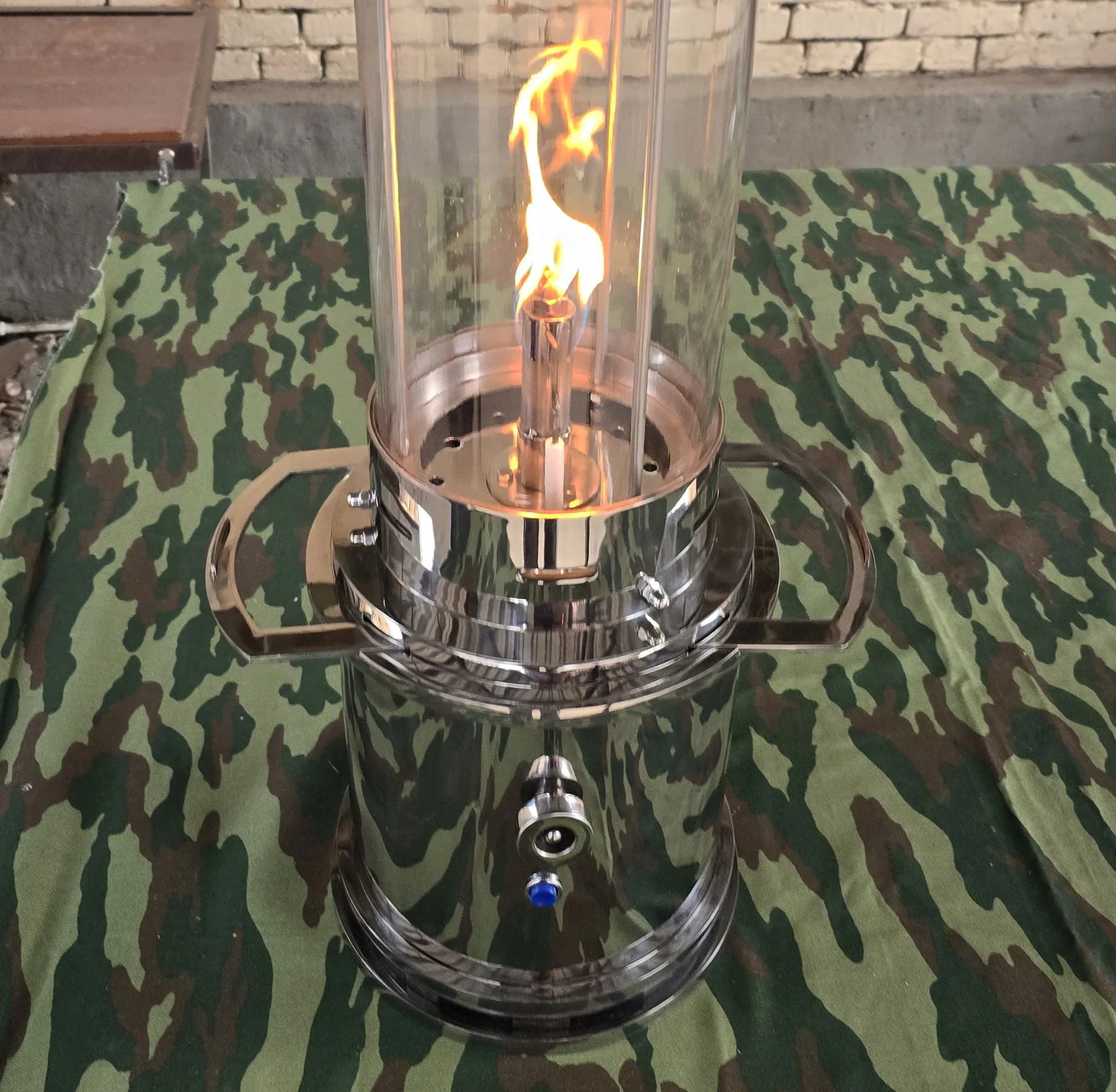 Материл корпуса капсулы – качественная нержавеющая сталь полированная до зеркального блеска, модуль ветрозащиты – кварцевое стекло. Топливный картридж капсулы – это стандартный газовый баллончик по типу походного - туристического для обогрева кемпинга.