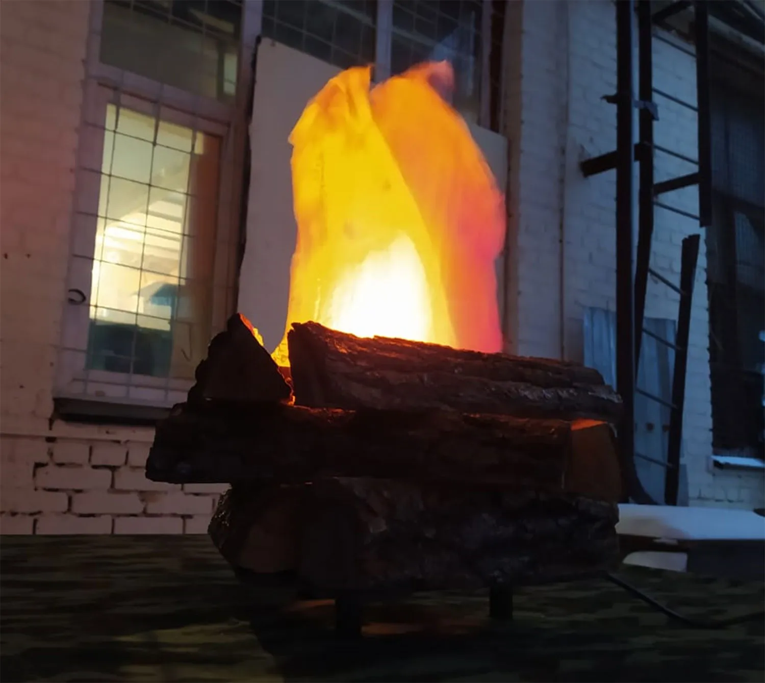 Принцип работы изделия крайне прост: кусок ткани (два куска тончайшего шелка) крепятся над небольшим вентилятором. Цветные светодиодные лампочки освещают ткань, развевающуюся в направленном потоке воздуха вентилятора. Сочетание движущейся над костром ткани и цветной LED-подсветки создаёт на сцене весьма реалистичный эффект пламени…