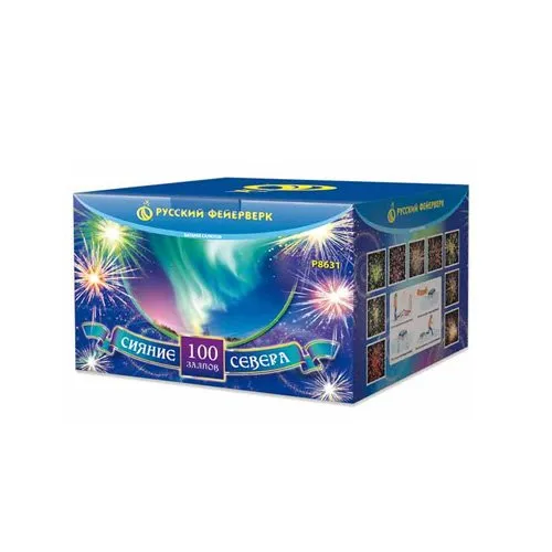 Эффекты: 1. Красные, зеленые звезды с белым мерцанием. 2. Красные и белые звезды с золотыми хвостами. 3. Фиолетовые и желтые мерцающие звезды с золотыми хвостами. 4. Белые мерцающие звезды и золотые кометы, переходящие в красные и синие звезды. 5. Красные звезды с золотыми хвостами и белым мерцающим треском. 6. Зеленые звезды с золотыми хвостами и белым мерцающим треском. 7. Зеленые мерцающие и белые трещащие звезды с золотыми хвостами. 8. Финал: внизу - залпы из трещащих искр, вверху - белые мерцающие звезды и сфера из золотых комет с треском.