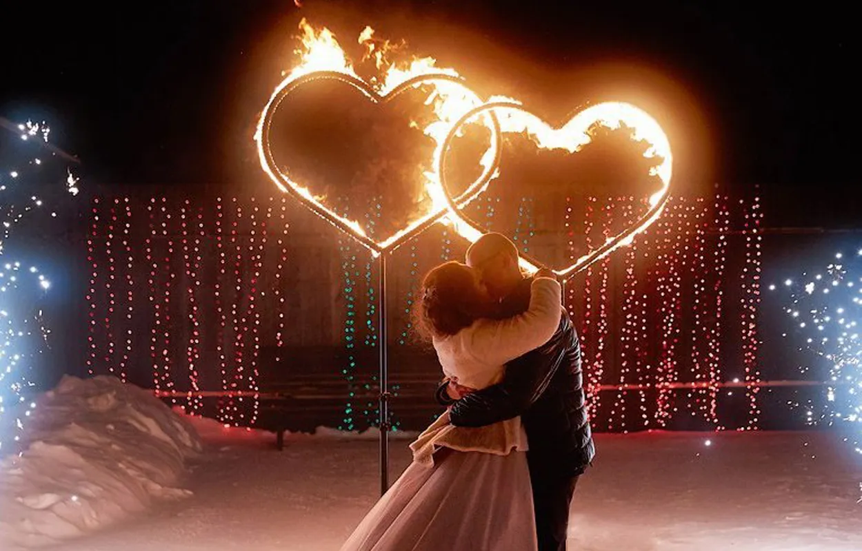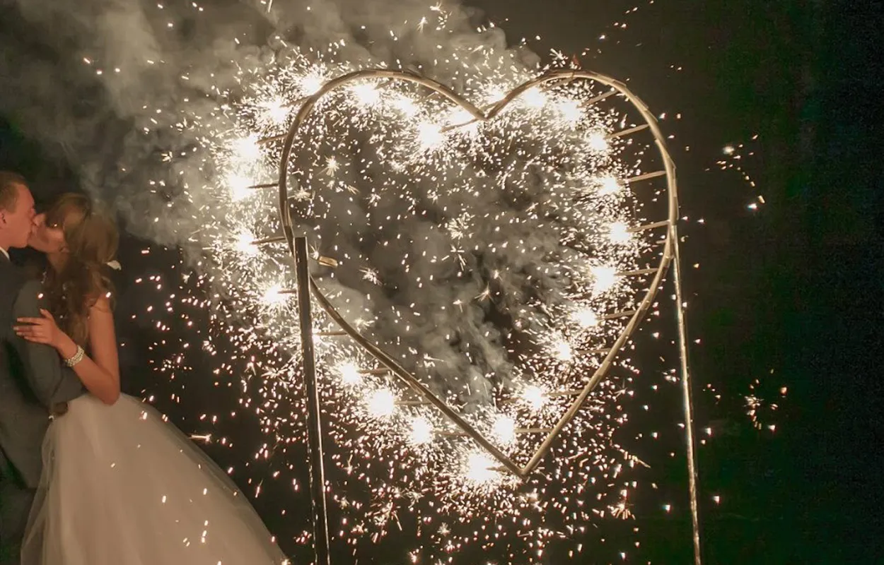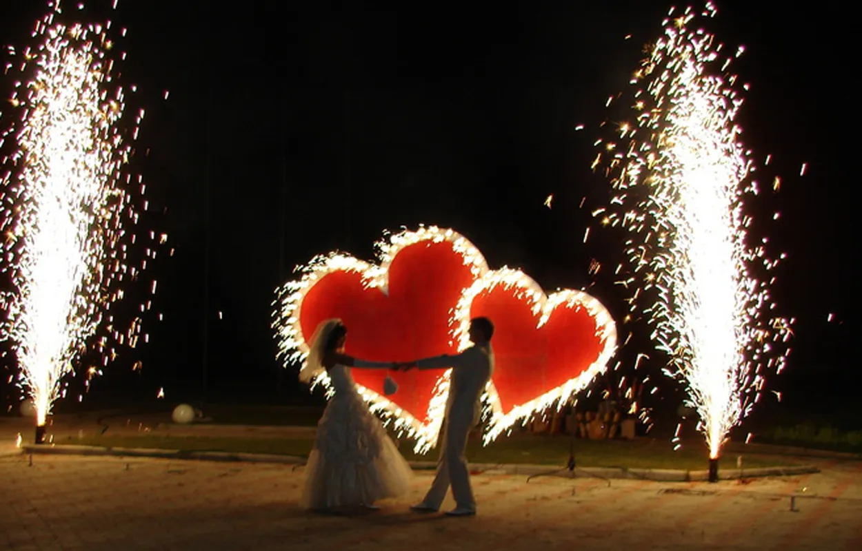 Предлагаем отличный сценарий свадебного фейерверка – наземная пиротехническая группа: пиротехническая дорожка из фонтанов, 2 огромные фейерверк вертушки по типу огненного колеса, горящие огненные 2 сердца, что сплетаются во едино, затем многоплановый парковый фейерверк, и только за ним крупнокалиберный высотный салют. Особое внимание следует уделить свадебному фейерверку «Горящие сердца», что особо может подчеркнуть торжественность момента и станет уникальным украшением праздничной площадки для свадьбы. Также оригинальным украшением свадебного праздника послужат наземные пиротехнические фигуры и фейерверк надписи. Если у Вас есть желание с размахом отпраздновать свадьбу или юбилей, яркое пиротехническое шоу – прекрасный способ сделать мероприятие незабываемым. Звоните и заказывайте горящие сердца из фейерверка на свадьбу – ваши идеи реализуют профессионалы!